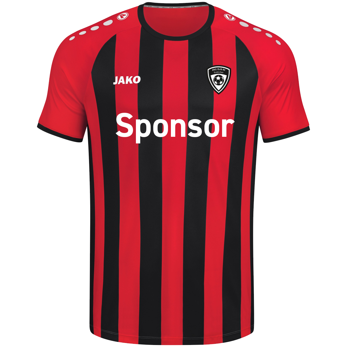 Die Budget Ausführung beinhaltet eine Budget Flex-Folie, das JSG Wappen auf der Brust in bunt und die Rückennummern ohne JSG-Wappen.